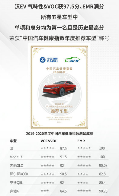 中国汽车健康指数由中国汽车工程研究院权威测试并发布,在2018年至2020年参与测试的41款车型中,汉EV单项得分和总分成绩均为第一名,拿到该项测试的历史最高分,并且是唯一三项指标全部第一的车型。