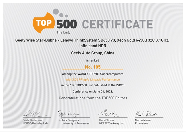 5月22日,在德国汉堡举行的国际算力大会( ISC 2023 )上,第61届全球算力500强最新榜单出炉,吉利星睿智算中心·智能仿真平台(Geely Wise Star-Dubhe)跻身榜单第185名,算力位居中国上榜制造业第一,吉利也成为首个进入全球算力500强的中国车企,开创了中国汽车智能研发领域的新里程碑。