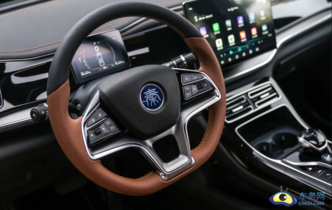 秦PLUS DM-i运用横向宽抱式内饰设计,凸显其层次感与品质感。此外,秦PLUS DM-i提供了行云蓝、流水棕两种内饰颜色给消费者选择。三辐式皮质方向盘手感细腻,两侧多功能按键也均是日常驾驶过程中较为实用的功能,左边主要是驾驶辅助功能,右边则是车机功能的控制按键。仪表则采用了尺寸不算很大的液晶屏,十分简洁。