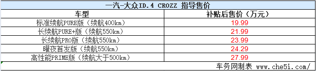 2021年3月20日,一汽-大众旗下ID.4 CROZZ车型正式开始交付。新车共推出5款车型,补贴后售价区间为19.99-27.99万元。作为一汽-大众引进的首款ID.系列车型,新车基于大众MEB平台打造,车身造型凸显时尚感,定位为紧凑型纯电动SUV。另外,根据车型的不同推出了400km、550km及大于500km三个续航版本供选择。
