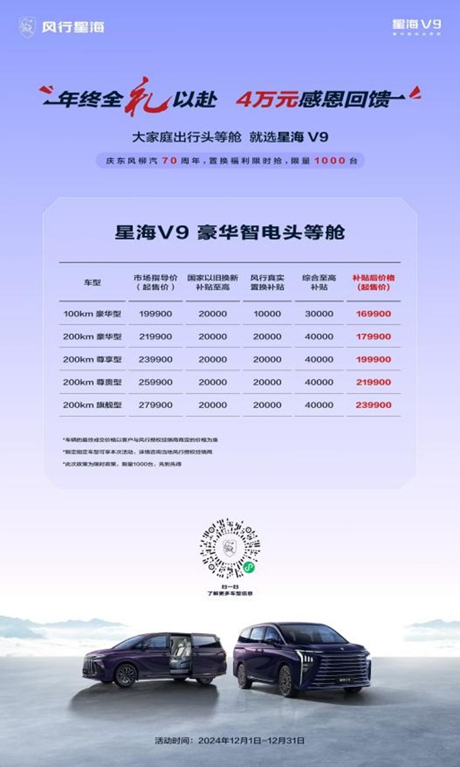 恰逢东风柳汽70周年庆典,东风风行重磅推出了星海V9置换优惠活动,目前置换星海V9可享受至高4万元的综合补贴,仅限前1000台置换名额,机不可失,详情可咨询当地风行授权经销商,让豪华出行生活轻松实现!