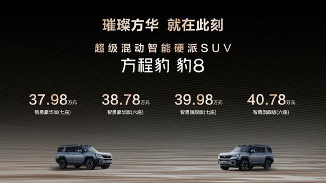 11月12日,比亚迪华为联合发布方程豹豹8上市,共发布4个款型,其中智勇旗舰六座版40.78万元、智勇旗舰七座版39.98万元、智勇豪华六座版38.78万元、智勇豪华七座版37.98万元。作为比亚迪30周年的旗舰之作,比亚迪华为首次联合开创的智能硬派,豹8定义了国货旗舰的顶级价值,开创了自己的价值公式——8=4x(1 1)。1台豹8等于 4大王牌科技,乘以1套全家舒享豪华配置加1个非承载式硬派车身,以“智勇双全”的非凡实力,开启全球智能硬派新时代。