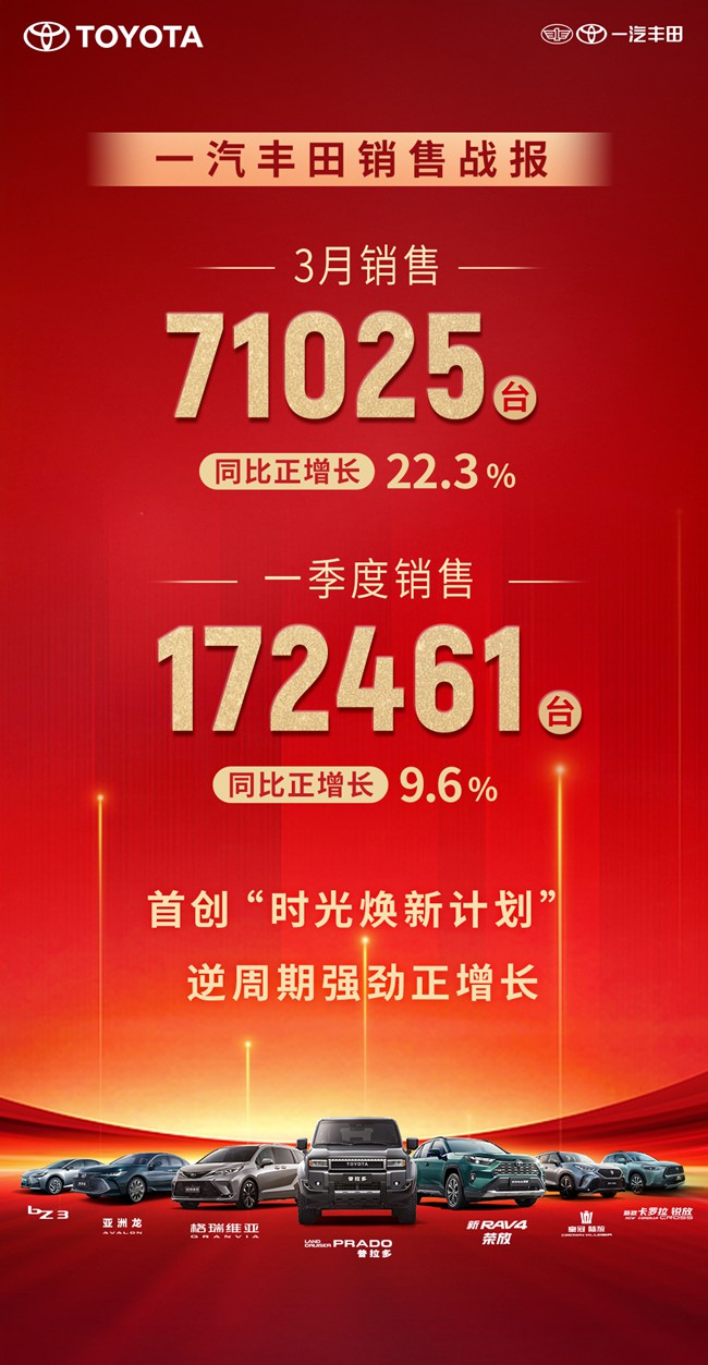 4月1日,一汽丰田率先公布了3月及一季度销量数据。3月,一汽丰田销售新车71,025台,同比增长22.3%;整个2025年一季度,累计销售新车172,461台,同比增长9.6%。这是继连续两年成为正增长主流合资车企之后,一汽丰田再次创造的新增长记录,续写了“合资亮色”。