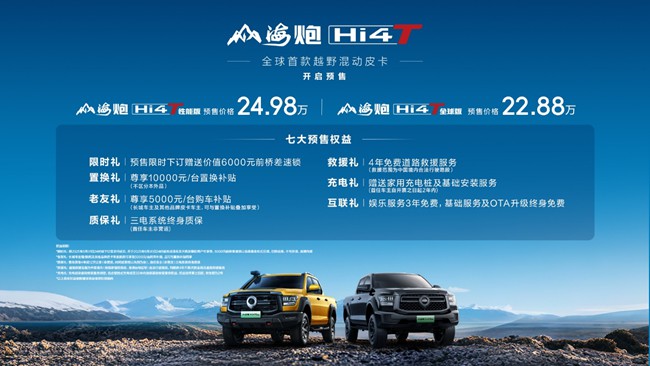 真新能源皮卡电炮来了!4月23日,“全球首款越野混动皮卡”山海炮Hi4-T正式开启全球预售。山海炮Hi4-T全球版官方预售价格为22.88万元,山海炮Hi4-T性能版官方预售价格为24.98万元,并同步推出限时礼、置换礼、充电礼等7大预售权益,价值拉满,诚意十足,保障用户用车无忧。