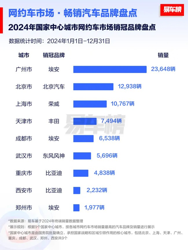 近日,易车发布2024年国家中心城市网约车市场销冠品牌榜单,埃安、北汽、荣威等品牌在榜。榜单显示,每个城市都有自己的“网约车销冠”品牌,以北上广为例,北京的“网约车销冠”是北汽、上海是荣威、广州是埃安,区域品牌偏好显著。