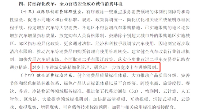 近日,国务院办公厅印发《关于进一步释放消费潜力促进消费持续恢复的意见》,其中明确提出,对皮卡车进城实施精细化管理,研究进一步放宽皮卡车进城限制。这无疑再次为皮卡行业注入一剂强心针,推动更大范围的皮卡解禁,有力提振中国皮卡市场的繁荣发展!