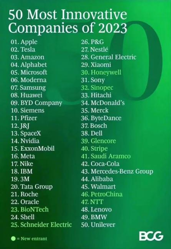 品牌领域,波士顿咨询公司(BCG)上周公布了2023年最具创新力公司榜单,特斯拉成为全球排名最高的汽车品牌,并在整体榜单中位列亚军,相较上年提升3个名次。