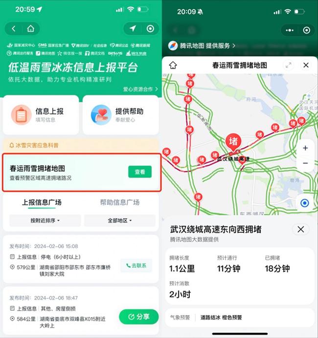 此前,应急管理部国家减灾中心、中央广播电视总台国家应急广播联合腾讯上线“低温雨雪冰冻信息上报平台”,“春运雨雪拥堵地图”也快速接入该平台,首页点击即可进入。该平台由腾讯SSV社会应急实验室、微信搜一搜、腾讯新闻、腾讯公益、腾讯文档、搜狗输入法等多个团队深度参与,并基于腾讯地图及腾讯出行服务基础平台能力实现,让社会公众通过微信小程序,能快速上报受灾情况和帮助信息,助力灾情研判和救援,也推动返乡道路互助。