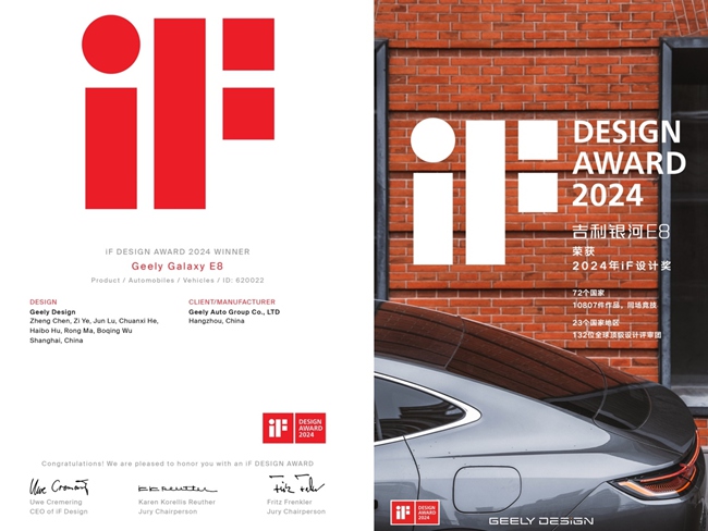 作为与德国红点奖、美国IDEA奖齐名的世界三大工业设计奖项之一,德国iF设计奖由久负盛名的汉诺威工业设计论坛于1953 年创立,以“独立、严谨、可靠”的评奖理念闻名于世,评选标准极为苛刻。今年的iF设计奖以“Idea”/ “Form”/ “Function”/ “Differentiation”/ “Impact”为评定标准,强调设计的全球影响力。吉利银河E8凭借颠覆性的“中国原创设计”,赢得来自23个国家的132位全球权威设计评审专家的高度认可。