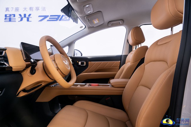 内饰方面, 内饰采用环抱式座舱设计,星光730搭配胡桃棕、暖沙棕双色主题,配备12.8英寸中控屏,支持HUAWEI HiCar和Carlink车机互联,还拥有小憩、露营、离车不下电等多场景模式,提升用车便利性与趣味性。