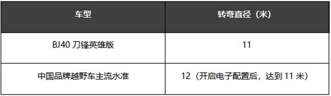 又如,大漠之中路况极其复杂,随时需要转弯变换方向。因此,一个最小的转弯半径,一定是非常必须的。刀锋英雄新品通过专利技术优化转向结构,实现了不足11米的转弯直径!市面上目前中国品牌越野车转弯直径多数在达12m的水平,通过对应电子配置辅助,方可达到11m左右,但是这要配合蠕行和特定非铺装路面方能实现,很显然没有刀锋用英雄这种“天生”的优势来得直接!