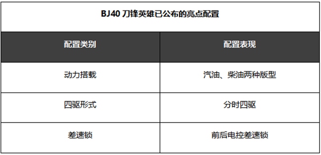 再如,为了达到长续航大扭矩的动力,刀锋英雄甚至还推出了柴油版本,搭载2.0D 8AT的动力总成,续航里程和驾驶平顺性或将成为该车最大的亮点;而应付沙漠里对胎压的实时掌握,刀锋英雄甚至连备胎都配备了TPMS,当然分时四驱配合前后电控锁实现的“三把锁”的优势在刀锋英雄身上必然也是标配……很显然,BJ40刀锋英雄,无论从命名还是产品表现来看,它就是一款以专业赛事理念标准打造的专业越野车,其身上到底还有多少达喀尔赛场的技术元素,相信也会在赛事凯旋之日公布于众!