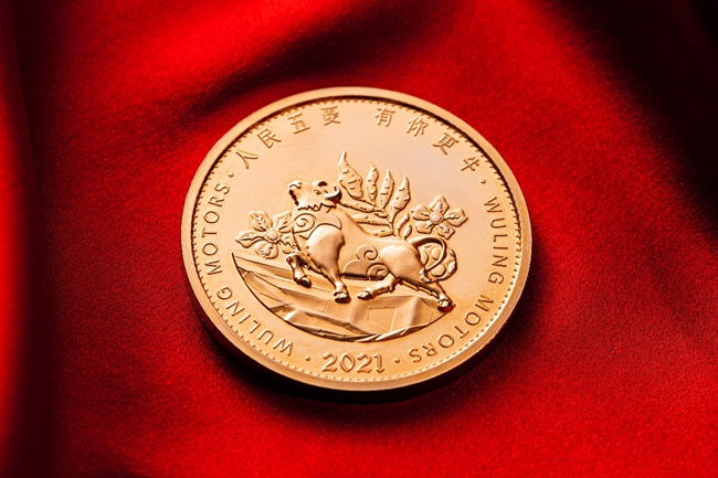 五菱牛年鎏金纪念章在细微之处尽显高超工艺,方寸之间尽显艺术灵感,正面雕刻“金牛献瑞”造型与金色繁花图案,四周镌刻“WULING·2021·WULING”及“人民五菱,有你更牛”祝福语,背面以五菱LOGO标识为中心,向四面散射黄金直线,彰显五菱和人民在2021年一起“牛”气冲天的美好希翼。