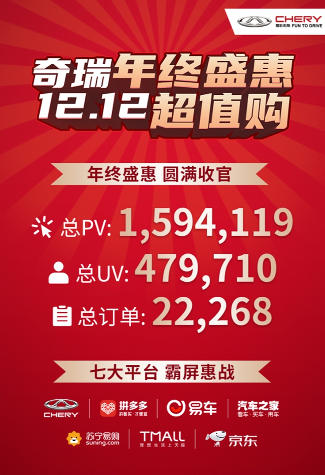 新零售方面,奇瑞在2020年加速与“新零售”平台合作,并对金融、车贷、保险等资源进行整合,建设自营和合作渠道,同时建立产品模型大数据,进行线上、线下集客销售,实现全域营销。去年“双11”期间,奇瑞汽车订单达到22117辆,首次突破两万,同比增长97.56%。而去年的“双12”,奇瑞“新零售”业务也再创新高。数据显示,整个“双12”期间,奇瑞汽车在全平台总PV(浏览量)1,594,119、总UV(独立访问量)479,710、总订单22268辆。
