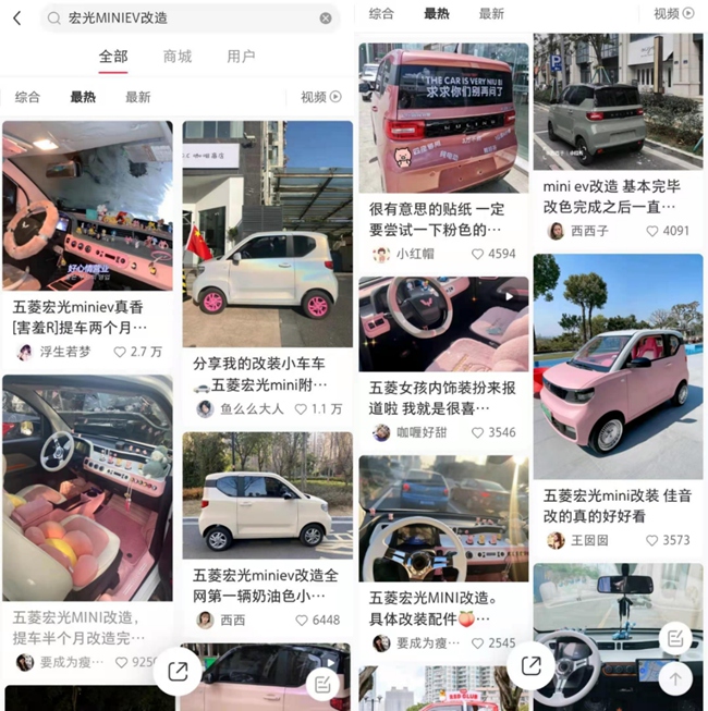 宏光MINIEV凭借方正小巧的车身具备得天独厚的改装潜力,上市至今,宏光MINIEV车主纷纷加入到潮创大军,目前有多达70%的用户会对自己的车进行潮创。宏光MINIEV与用户在潮创层面的“同频共振”,各大社交平台“众目共睹”,在小红书、微博等社交平台上充斥着大量关于宏光MINIEV的改装帖,尤其在小红书APP,#五菱宏光MINIEV改造#话题获得上千万次浏览量,满屏都是车主玩家们的改装作品,或是“卡哇伊”可爱风,又或清新浪漫STYLE,花样百出。可以说,宏光MINIEV已不仅仅是一台车,更是一款具有社交属性的时尚潮流单品。