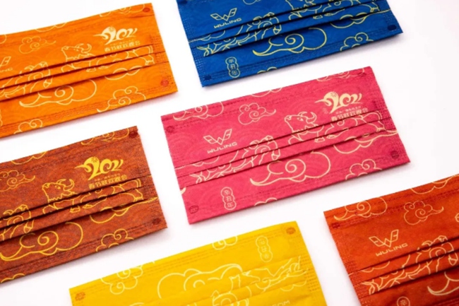 央视春晚“五菱红”口罩印有五菱 LOGO 与“2021 中央广播电视总台春节联欢晚会”图标,口罩中央两头昂扬向上的中国牛周围环绕着朵朵祥云,饱含新年吉祥如意的祝福,以及五菱与人民一起“牛”的美好希翼。
