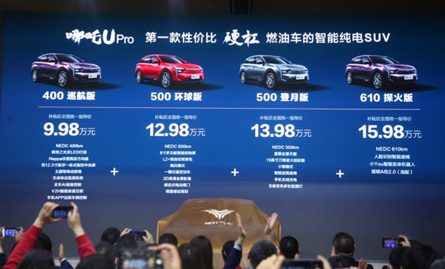 车展现场,哪吒U Pro正式上市。新车推出400 巡航版、500 环球版、500 登月版、610 探火版四款车型,补贴后官方售价分别为9.98万、12.98万、13.98万、15.98万元。针对哪吒U Pro上市,哪吒汽车推出极致金融礼、终身保驾礼、护航无忧礼,为消费者提供超值的购车优惠。