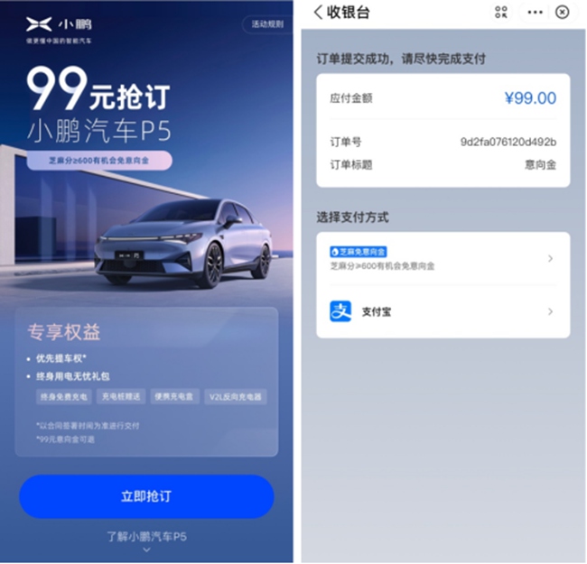据介绍, 2021年4月19日起(截止日以官方公布时间为准),对于意向购买小鹏P5的车主,如果是支付宝实名认证用户且芝麻分≥600分,即可通过支付宝-小鹏汽车小程序-P5预订活动页,以0元抢订P5新车权益大礼包(þ优先提车权,享受优先交付权益;þ终身用电无忧礼包:终身超充免费、专属家用充电桩、便携式充电盒、反向充电器,价值超2万元),凭芝麻分免除99元订新车意向金。