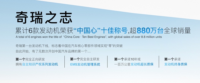 作为一家“技术立企”的中国汽车品牌,奇瑞汽车早在创立之初,就立志要走自主创新,产业报国之路。尤其在汽车动力方面,以无数次中国汽车品牌的第一,抒写了奇瑞之志。截止目前,奇瑞累计6款发动机荣获“中国心”十佳称号,全球销量超过880万台。