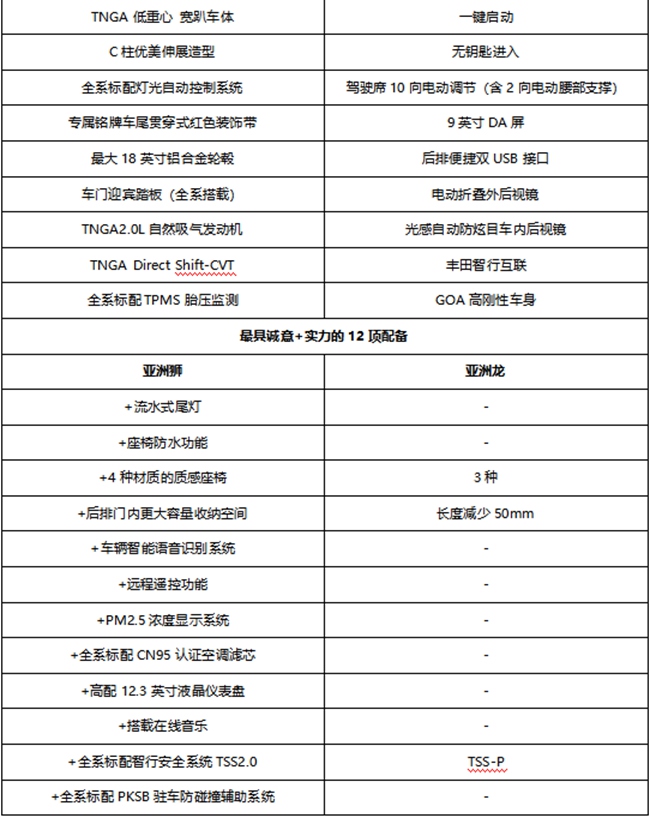 诞生于TNGA架构的亚洲狮,通过强大的产品实力,重新定义了中级轿车应有的高级感、档次感,2.0L的黄金动力总成技术水准行业顶尖,2750mm奢享大空间满足全家出行需求,全面的安全标配伴用户放心驾驶。在亚洲狮三大核心商品优势的加持下,一汽丰田以亚洲狮树立越级新标准,为 “量产幸福”承诺注入新力量。