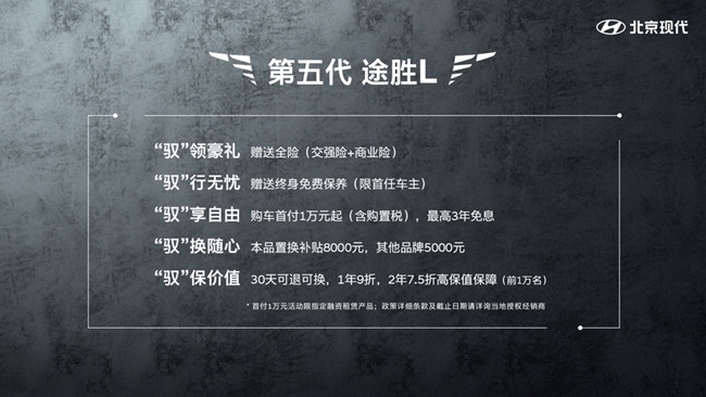 通过前卫造型设计、舒享空间体验、便捷智能互联、高效动力输出,以及全面守护的安全性,第五代途胜L为当代年轻人带来“五大时刻”的巅峰体验,成为其多元化生活方式中的最佳移动出行伴侣。此次第五代途胜L上市之际,北京现代还推出五大超值金融与服务政策,比如,在购车环节,北京现代提供首付最低一万元(含购置税)或最高3年免息的金融政策,并赠送交强险与商业险。同时首任车主还可获得终身免费保养权益。五大政策的推出,降低用车门槛,方便更多城市先锋青年率先体验潮流出行。