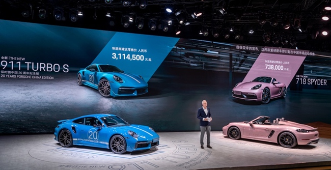 上海。4 月 19 日至 28 日,保时捷携全系车型亮相第十九届上海国际汽车工业展览会,在品牌进入中国大陆20周年之际,发布两款重磅新车,表明了其推动跑车文化发展的决心与信心。全新 911 Turbo S 保时捷中国 20 周年纪念版由保时捷独家定制部门Porsche Exclusive Manufaktur倾力打造,整体设计灵感源自保时捷对中国社会“继承传统,不断创新”发展理念的洞察,将极具保时捷品牌辨识度的经典传承元素——5 款特殊车身颜色——搭配最新旗舰911 Turbo S(992款)共同诠释了独特的设计理念,再辅以车内外诸多精巧的定制化设计,不仅彰显了纪念版车型的独特身份,更提升了收藏价值。另一款首发新车是全新 718 Spyder,时隔多年,保时捷再度将 Spyder这一经典车身形态以 718 Spyder车型引入中国,满足车迷对其独特敞篷乐趣的期待。两款新车即日启动中国预售,全新911 Turbo S 保时捷中国 20 周年纪念版专为中国市场打造,制造商零售价 3,114,500 元;全新 718 Spyder 738,000 元。
