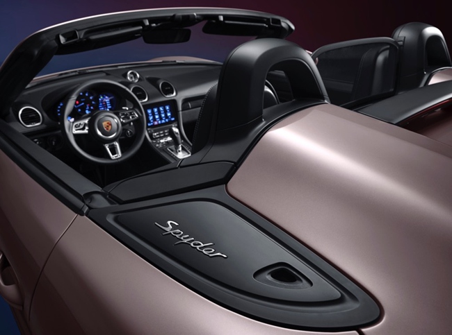 内饰方面,全新 718 Spyder 标配 360 mm 多功能 GT 运动方向盘、Sport Chrono 组件和 14 向全电动运动型座椅,凸显运动风格。门槛护板和中央转速表等位置均可见 Spyder 字样,于细节中强调了传奇跑车的身份。可供选装的 Spyder Classic 内饰组件包含诸多借鉴前辈赛车的经典元素,包括:波尔多红/黑色双色调内饰,采用 Race-Tex 面料的门板、中控储物箱盖板和座椅中心,采用波尔多红真皮的头枕和座椅两侧衬垫,以及车内各处极具视觉冲击力的 GT 银饰件。此外,保时捷首次提供红/黑双色调车顶,将整车的传奇氛围推向高潮。
