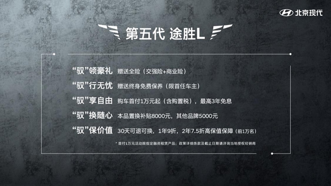 针对这一情况,北京现代以用户思维出发,推出涵盖用户购车、用车、置换全环节的五大服务政策,为城市先锋青年量身打造一站式安心服务体验。下面我们就来看看第五代途胜L的“薅羊毛”攻略。