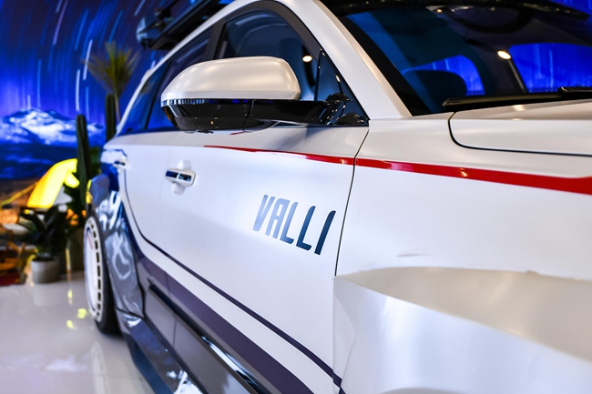 “小白白”车身采用上下分层的亮白与浅灰撞色涂装,配以蓝、红色饰条以及“Valli”专属字标,休旅气质展露无遗。全车造型进行低趴设计,前脸加装前铲包围,营造硬朗霸气氛围,带给用户旅途中贴地飞行的炫酷体验。