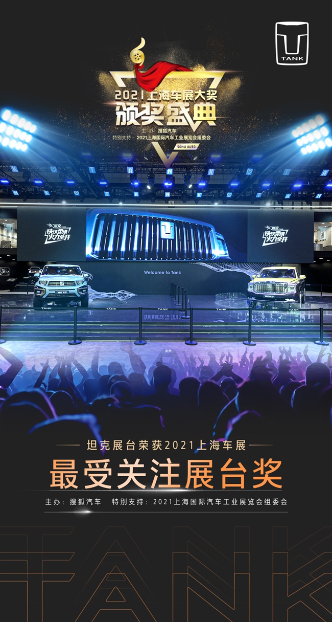 会玩儿的坦克品牌不仅如此,现场布置了三台风格不同的改装版坦克300。无论是以未来科技风格改装的赛博坦克,还是硬核刚强的硬派越野风格——风林铁骑版,或是从容侠气的坦克游侠,坦克品牌以敢玩儿的心态,将当下消费者喜爱的元素融入车中,真正塑造了属于坦克的硬核时尚潮流。凭借硬核产品实力和酷炫的潮玩儿圣地,坦克聚集了超高人气,一举拿下由2021上海国际汽车工业展览会组委会特别支持,搜狐汽车主办的“2021上海车展大奖”之“最受关注展台奖”,成为上海车展一道最瞩目的靓丽风景。