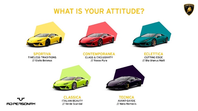 这一合作项目对代表不同兰博基尼客户特征的多种性格进行了区分,按照不同的文化背景、喜好、个性和态度,分为5种不同风格。
