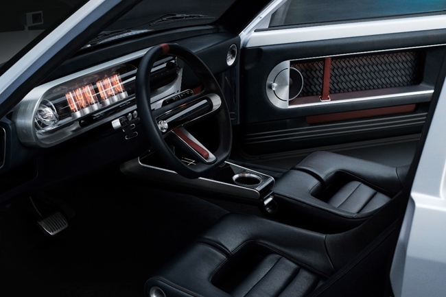 在内饰设计上,“传承系列 PONY”更显独特。打开车门,仿佛走入了“赛博朋克”的世界。蕴含经典设计的车门表面被高品质的材料包覆,现代化的内饰氛围灯光系统与其结合形成了强烈的视觉冲击。而最让人“称奇”的是突破想象的车速仪表,其由多个发光真空电子管组成,复古与未来的融合风格极尽彰显。