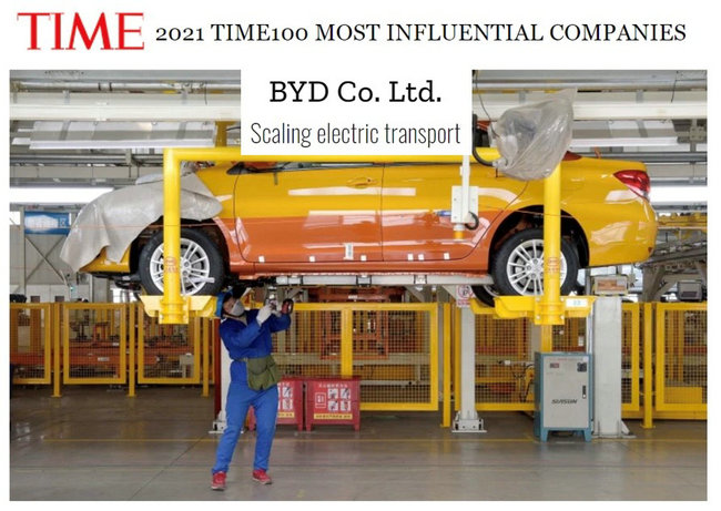 2021年4月27日,美国《时代周刊》(TIME)评选出了“最有影响力的100家企业”(2021 TIME100 Most Influential Companies),比亚迪成功入选,成为榜单上唯一来自中国的新能源整体解决方案供应商。