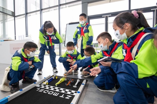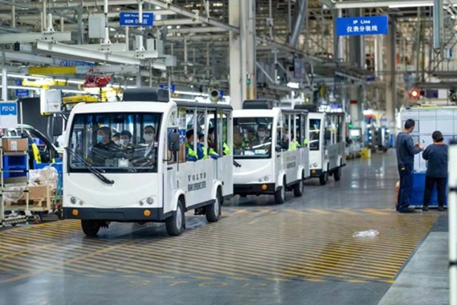 学生们乘坐观光车探秘沃尔沃汽车成都制造基地