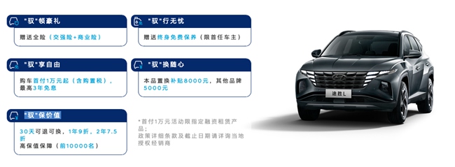 伴随着第五代途胜L的问世,北京现代更为这款车打造了五大超值购车礼遇:赠送全险(交强险 商业险)、赠送终身免费保养(限首任车主)、购车首付1万元起(含购置税)最高3年免息、本品置换补贴8000元其他品牌5000元、30天可退可换1年9折/2年7.5折保值率。