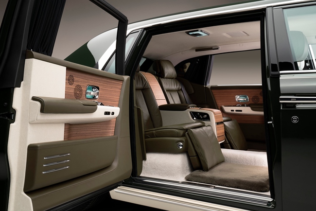 幻影“织布烧”典藏版采用引人注目的双色车身色调。因其车主是一位著名的“织布烧”陶器收藏家,该车车身上采用了专属打造的、与日本古代“织布烧”陶器标志性的绿色与奶油色釉面相呼应的外漆。该配色由英国古德伍德车表抛光中心(Surface Finish Centre)的专家历经数月研制而成,完美地体现了这一16世纪经典陶器深绿色光泽釉的特点。车身下部的乳白色搭配,则进一步衬托出外观效果的卓尔不群。不仅如此,劳斯莱斯还罕见地同意将这一色调用于车主的私人飞机之上,令车主的私人飞机可以与这款幻影Bespoke高级定制车型遥相呼应。