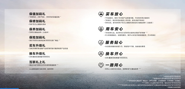 具体包括:1年85折,2年75折,3年65折保值回购的“保值加码礼”;5年15万公里整车质保的“保修加码礼”;5年6次基础保养(含首保)的“保养加码礼”;预交1000元续保金享3000元原厂精品的“保险加码礼”,覆盖了客户用车的维保周期,不仅降低了客户的用车成本,更使车辆的保值率得到极大提升。