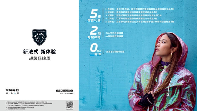 同时,为进一步加强车主权益,在5月15日-5月23日期间,东风标致开展的“520超级品牌周”活动,特别设置了用户团购活动。东风标致将限时推出“520”加码政策,用户进店购车即可享受5重大礼、2大保障、0压力的购车政策。