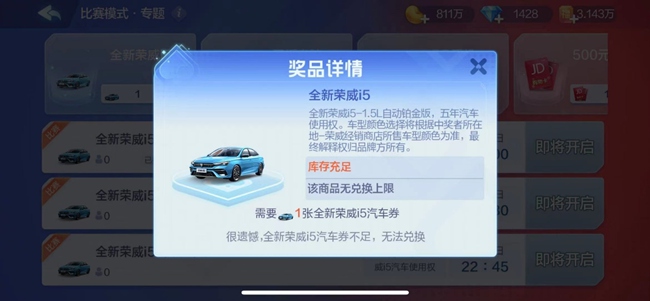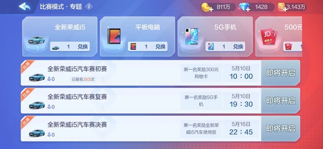 全新荣威i5汽车赛分为初赛、复赛、总决赛三大赛程。通过游戏对决比拼,每位玩家均有机会获得奖励,积分排名领先的玩家更有机会获得话费、购物卡、5G手机、平板电脑等。值得一提的是,本次汽车赛将持续4周的时间,每周都将产生一位总冠军,机会多多,所有玩家都有机会获得全新荣威i5五年使用权大奖。此外,玩家还可以通过“领奖中心”,参与“荣威送礼”夺宝&兑换活动,赢取更多奖品。