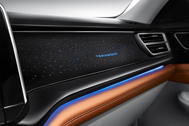 全新途昂双层悬浮式仪表台的高光图案装饰板,采用高品质工艺,搭配渐变星空造型图案氛围灯,点亮时视觉上极富科技感。星空环绕式透光饰条延伸至门板,加强内饰环绕感同时更带来了浪漫的星空内饰氛围。得益于LED光导式发光技术,让光感分布均匀,发光效果更柔和美观。