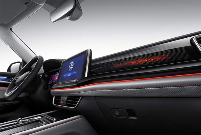 全新途昂X则采用X-ray镭射光束式透光饰条,更显潮流运动风范。仪表台下层为飞翼式造型的软质包裹,搭配缝线设计,表现了极佳视觉效果和豪华感。