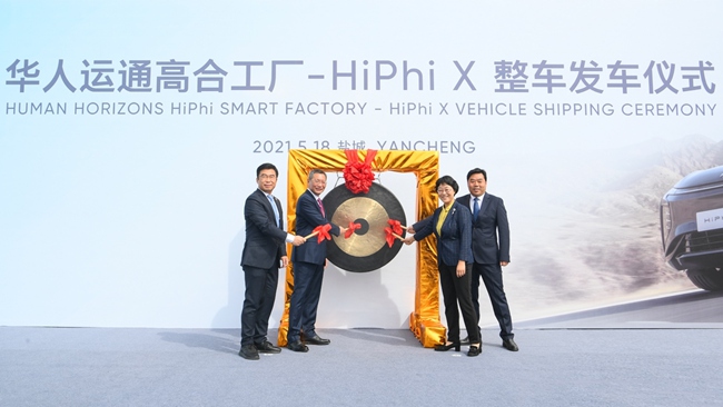 2021年5月18日,“华人运通高合工厂-HiPhi X 整车发运仪式”在江苏省盐城市中心的高合城市精品工厂成功举行,标志着华人运通高合汽车全国车主交付正按计划如期稳步推进。