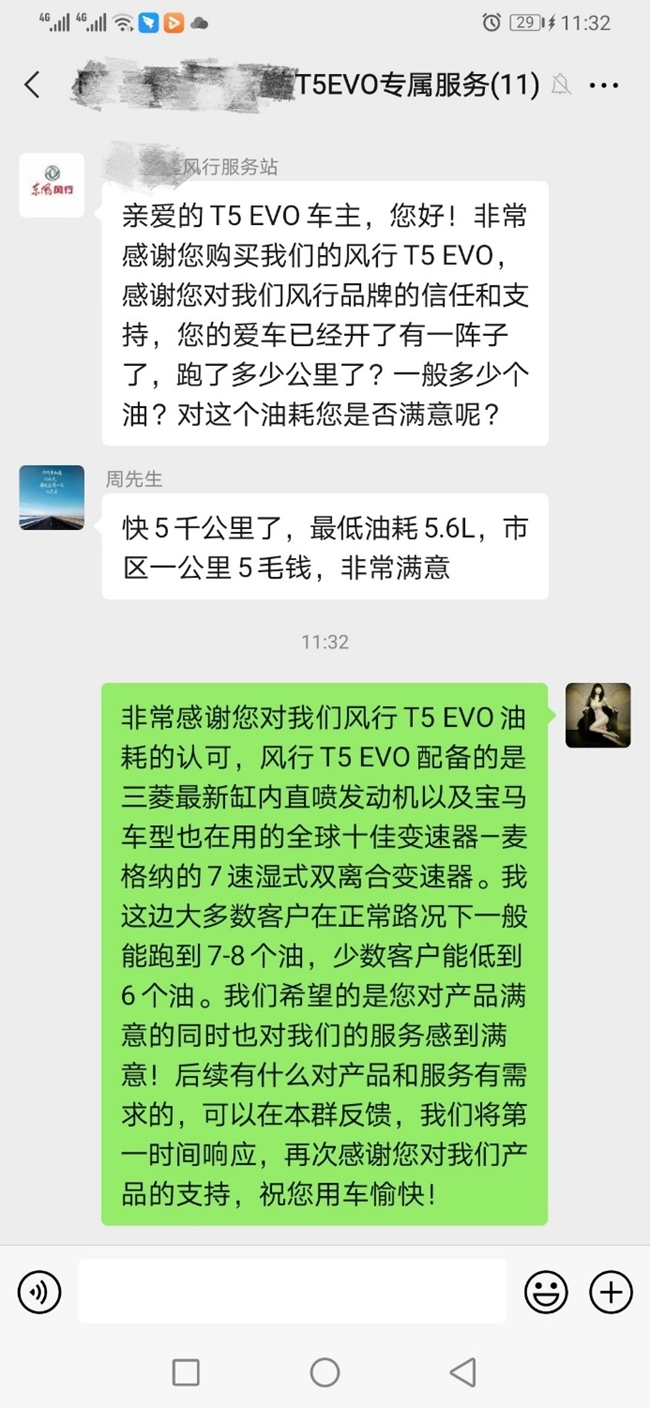 风行T5 EVO拥有高效节能的黄金动力组合,搭载三菱1.5TD高性能发动机,最大功率145kW,峰值扭矩285N·m,匹配7速湿式双离合变速箱,动力输出源源不断,换挡表现细腻平顺,发动机在转速达到5600转时可输出145kW的最大功率,而285N·m的最大扭矩在发动机转速为1500转时即可产生并可持续输出至4000转,让起步、加速性能更为强劲,百公里综合油耗仅为6.6L,让车主在畅享驾驭激情的同时亦可有效节省日常用车成本。作为一款紧凑级SUV车型,风行T5 EVO超低油耗让众多车主大呼惊喜。车主周先生就对爱车赞不绝口:“我的车开了快五千公里了,最低油耗5.6L,市区一公里五毛钱,非常满意。”