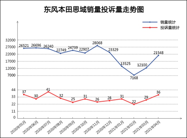 在经历2020年四季度开始的四连跌后,东风本田思域的月销量降至谷底,不过很快便完成调整实现销量反弹,4月份思域的销量再次重返“两万辆俱乐部”。从其近一年来的销量投诉量走势来看,除2020年年底销量出现下滑外,其余月份均稳定保持在2万辆以上,市场走势表现强劲。反观其月投诉量,近一年来的走势同样较为平稳,并未出现大起大落,4月份的投诉量虽然较3月份略有上升,但由于销量大幅提升,投诉销量比表现反而要好于3月份。整体来看,思域已经完成了阶段性调整,未来将有望延续上升走势。另外,有消息称第十一代思域将于年内上市,届时借助车型换代的红利,思域的月销量或将迎来新一轮的爆发。