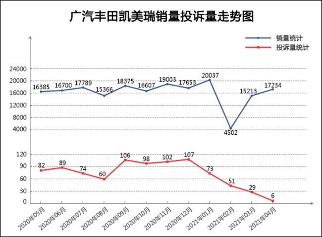 作为国内中型车的老大哥,广汽丰田凯美瑞多年来在国内市场一直持续热销,常年位居中型车销量榜头部位置。4月份,凯美瑞的销量实现“两连涨”,进一步向上攀升。结合其近一年来的销量投诉量走势可以看出,凯美瑞的市场表现相当稳健,除2月份外,其余各月份的销量均稳定保持在15000辆之上。不过,在2020年三、四季度凯美瑞的月投诉量出现异常波动,但进入2021年后,凯美瑞的投诉量呈现出直线下降的走势,4月份已经降至个位数水平,可见厂家在面对车主抱怨时,能够及时沟通并合理解决,从而避免维权事件升级。随着质量口碑恢复常态,凯美瑞的销量也有望迎来快速增长,能否再次突破2万辆大关,令人期待。