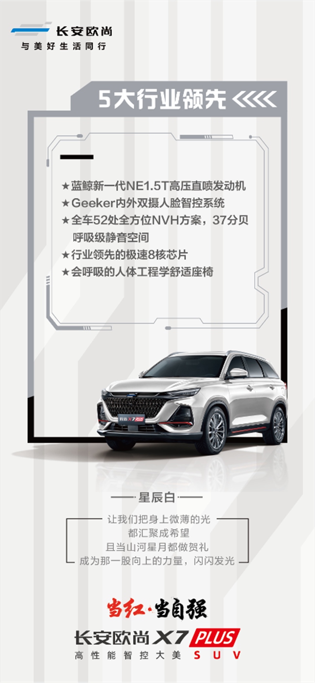 在用车体验上长安欧尚X7PLUS拥有五大行业领先的高价值配置:蓝鲸新一代NE1.5T 高压直喷发动机、Geeker内外双摄人脸智控系统、全车52处综合NVH方案,37分贝呼吸级静音空间、行业领先的极速8核芯片、会呼吸的人体工程学舒适座椅。
