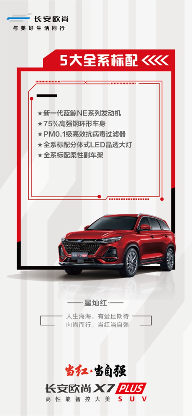 近日,长安欧尚X7PLUS产品配置首次全面曝光,新车全系标配新一代蓝鲸NE系列发动机,并推出1.5T 6MT和1.5T 7DCT两种动力组合共计9款车型,“星灿红、星辰白、星际灰、碧空蓝、丹青蓝、星空蓝”6种车身配色可选。作为长安欧尚首款PLUS旗舰产品,长安欧尚X7PLUS以“五大行业领先、五大同级领先、五大行业首创、五大全系标配”的高价值配置,将树立“15万级SUV价值新标杆“,新车将于8月27日正式预售。