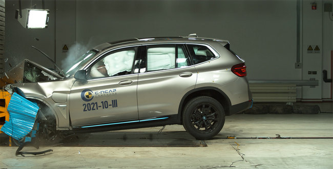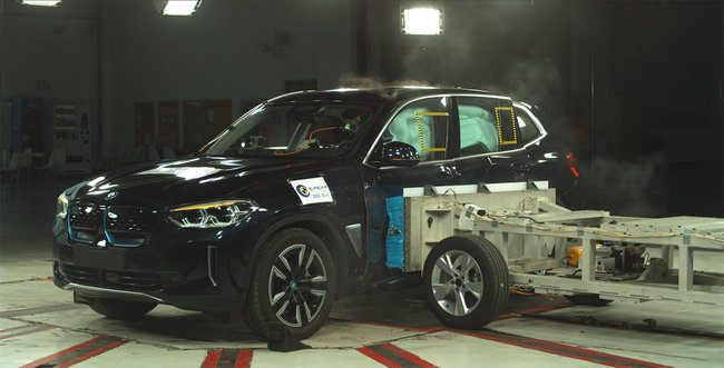 乘员保护测试项目分为完全正面碰撞试验、侧面碰撞试验、40%偏置碰撞试验和鞭打试验,BMW iX3在各分项的得分分别为19.546、20、19.259和4.840,且在加分项中获得4.000分,总分67.645分,得分率96.64%。这一优异的成绩得益于BMW iX3出色的被动安全设计,其大量采用的1000兆帕热成型高强度钢材结合合理的结构刚度分布,为用户打造坚固的驾乘空间。而在行人保护测试中,BMW iX3的得分率为87.01%,是因为车辆配备主动弹起式机盖,检测到行人碰撞瞬间即可弹起,有效减缓对行人头部的冲击。
