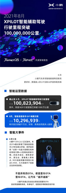 2021年09月17日,小鹏汽车发布8月份月度智能报告。小鹏汽车多项智能功能用户使用数据再创新高,XPILOT智能辅助驾驶行驶里程突破1亿公里,达到了100,823,904公里,其中,NGP智能导航辅助驾驶行驶里程已突破1000万公里,超高的用户使用数据充分展现了小鹏智能辅助驾驶系统广泛的应用范围和用户的高度认可。与此同时,8月份小鹏汽车智能语音助手小P单月唤醒次数首次突破千万次大关,达到了10,296,939次。小鹏汽车全语音车载系统正引领着车载交互方式的新变革,为用户带来更直接、更高效、更自由的车载交互体验,好用、易用自然更多人使用。