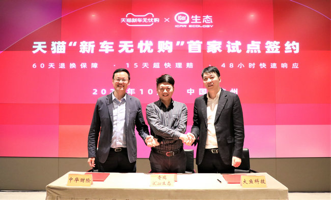 (天猫汽车整车业务总经理樊伟俊、中华财险浙江分公司总经理王靖玮、大鱼科技CEO吉炜共同签署项目发布确认书)